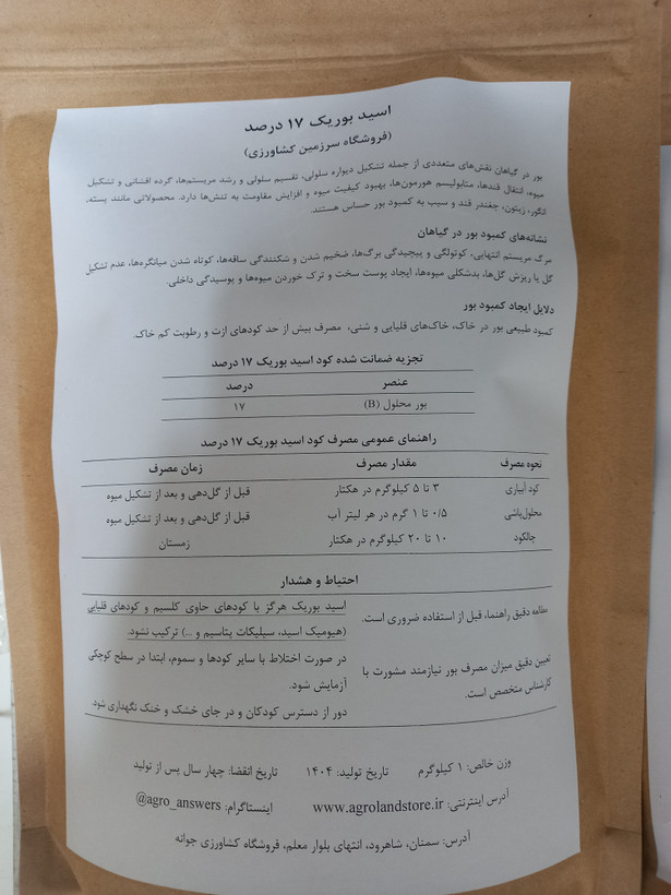 کود اسید بوریک سرزمین کشاورزی (بسته‌بندی 1 کیلوگرمی)