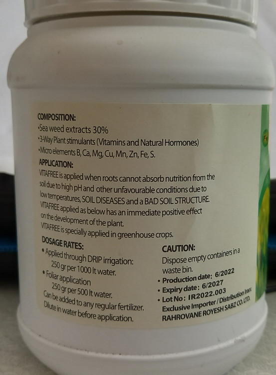 میزان مصرف به صورت آبیاری قطرهای: 250 گرم برای 1000 لیتر آب.